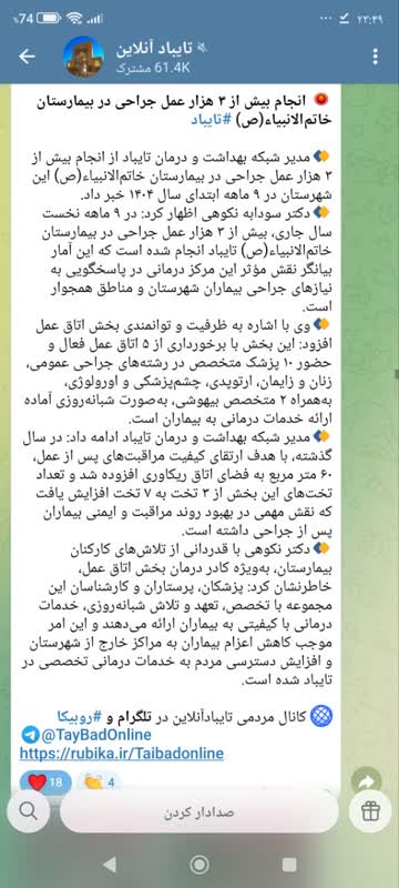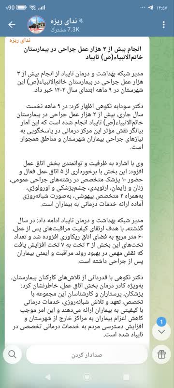 دکتر نکوهی با قدردانی از تلاشهای کارکنان بیمارستان، بهویژه کادر درمان بخش اتاق عمل، خاطرنشان کرد: پزشکان، پرستاران و کارشناسان این مجموعه با تخصص، تعهد و تلاش شبانهروزی، خدمات درمانی با کیفیتی به بیماران ارائه میدهند و این امر موجب کاهش اعزام بیماران به مراکز خارج از شهرستان و افزایش دسترسی مردم به خدمات درمانی تخصصی در تایباد شده است.