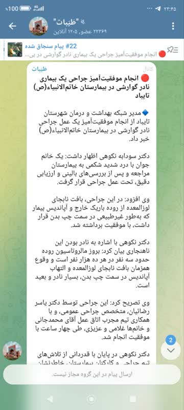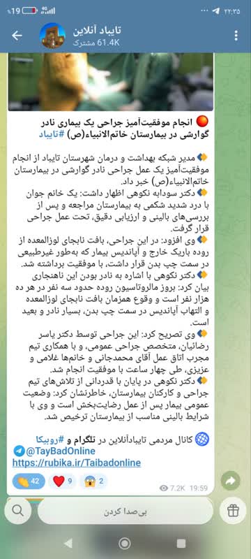مدیر شبکه بهداشت و درمان شهرستان تایباد از انجام موفقیتآمیز یک عمل جراحی نادر گوارشی در بیمارستان خاتمالانبیاء(ص) تایباد خبر داد.