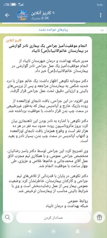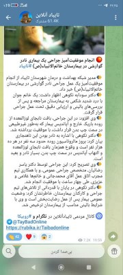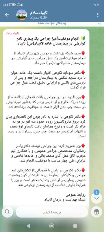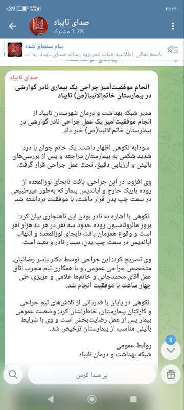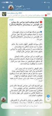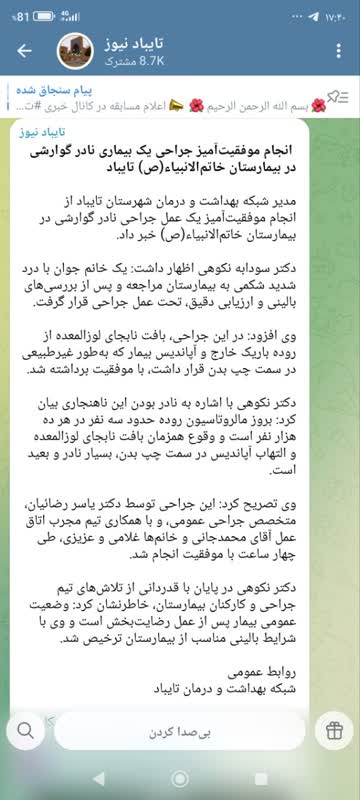 مدیر شبکه بهداشت و درمان شهرستان تایباد در پایان با قدردانی از تلاشهای تیم جراحی و کارکنان بیمارستان، گفت: وضعیت عمومی بیمار پس از عمل رضایتبخش بوده و وی با شرایط بالینی مناسب از بیمارستان ترخیص شده است.
