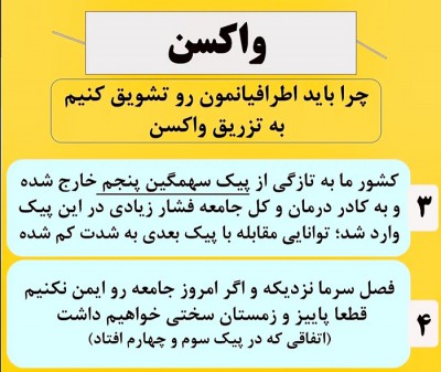 📌 فصل پاییز و زمستان برای انتشار ویروس کرونا بسیار پر خطر هست خواهشمندیم با تزریق واکسن و ایجاد ایمنی اجتماعی از شروع پیک بعدی جلوگیری نماییم.