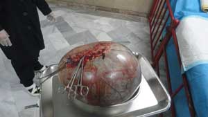 خارج کردن کیست 10 کیلويی از شکم مادر 31 ساله در بيمارستان خاتم الانبیاء(ص) شهرستان تایباد با مراجعه مادر 31 ساله به بیمارستان خاتم الانبیاء(ص) شهرستان تایباد با علائم درد شکم و سیری زودرس و بعد از لاپاراتومی آقای دکتر عینک چی کیست