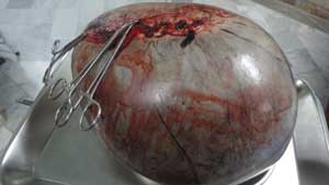 تخمدان تشخیص داده و بعد از عمل کیست 10 کیلويی با ابعاد 14*37*40 از شکم این مادر خارج شد.
